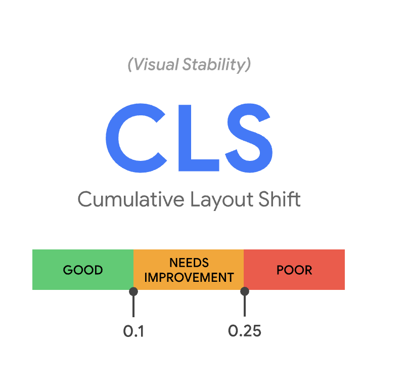 Cumulative Layout Shift (CLS) measures visual elements and overall design stability. Strive for <=0.1s.