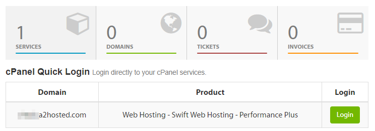 Once you're logged in, you'll come to your main dashboard. Not every provider uses the same type of platform, but in our case, you can find an option to access your site's cPanel under the main dashboard: