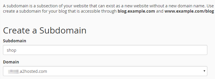 Creating subdomains using cPanel is remarkably simple. Scroll down until you find a section named Domains, then look for the Subdomains option and click it. From here, choose a name and specify the domain you'd like to add it to. In this example, we're setting up a shop subdomain: