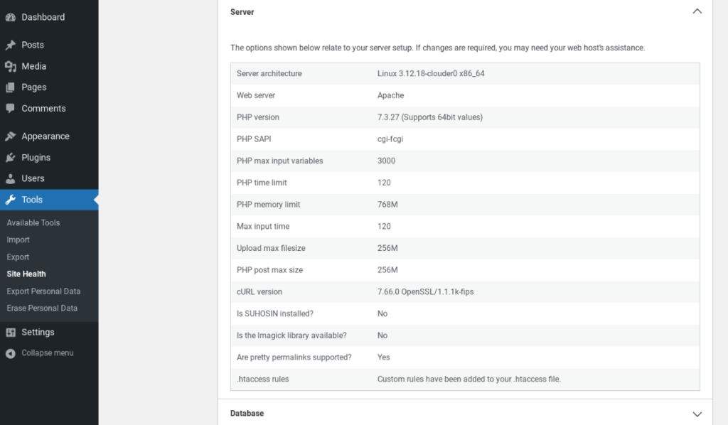 If you’re unsure which version of PHP you’re currently using, don't worry. You can find this information on the WordPress Site Health screen. Assuming that you have WordPress 5.0 or higher installed, navigate to Tools > Site Health > Info > Server: