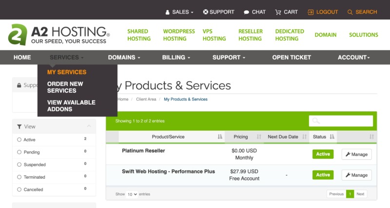 If you’ve forgotten your SSH password, you can recover this information at any point by logging into your Hosting.com Client Area. Then select Services > My Services: