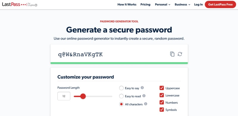 When choosing a password, it may help to use a password generator. Some popular choices include Secure Password Generator and the LastPass tool: