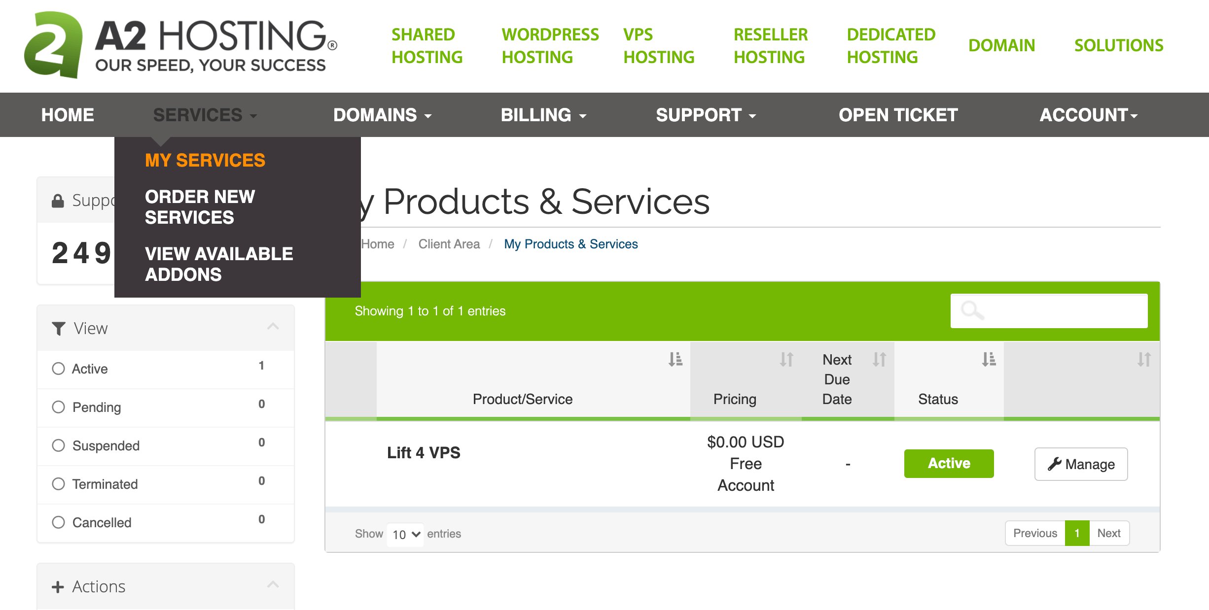 To start, you’ll need to know your IP Address, SSH Port, and root password. Hosting.com customers can find all of this information by logging into the client area. In the toolbar, select Services > My Services: