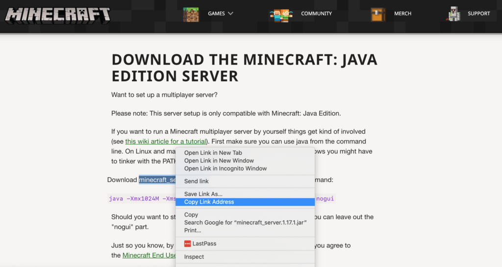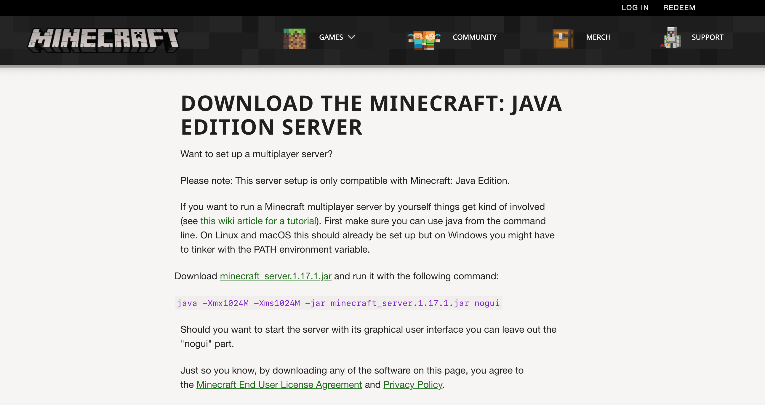 Now that we’re inside the Minecraft directory, it’s time to install the Minecraft software! At the time of writing, the latest version of Minecraft Server was 1.17.1. However, you can always check the official Minecraft website for the most recent update. On that page, find the download Minecraft server link: