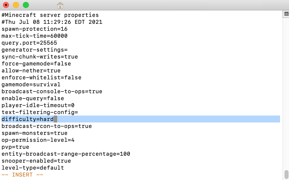 If you want to really challenge your players, you could use the arrow keys to navigate to the difficulty=easy line. You can then edit these settings.