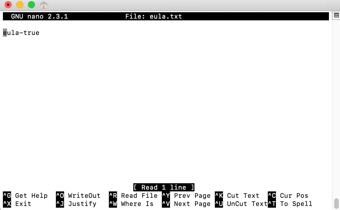 Now, read through the EULA. If you agree to the terms and conditions, change eula=false to eula=true: