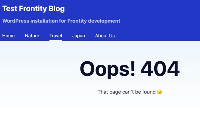 Frontity is now connected to your website, but the menu still contains links to Frontity’s demo content (Nature, Travel, Japan, and About Us). If visitors click on any of these links, then they’ll encounter a 404 error: