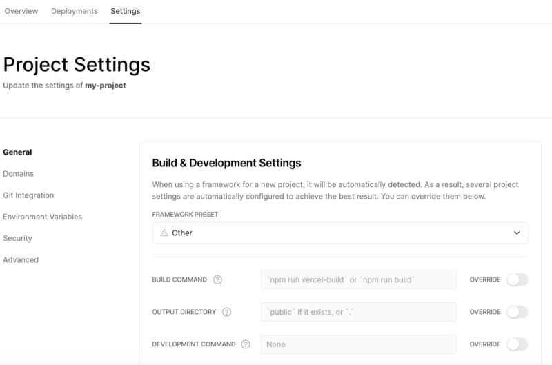 Here, you can make various changes to your project, including assigning new domains to your deployment, and integrating Vercel with Git so that changes are pushed to your Git repositories automatically.