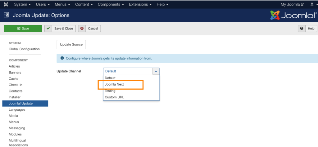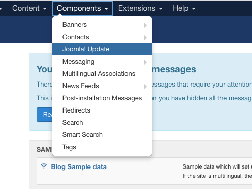 - After saving your website's complete backups, you must check if it meets the requirements to update. To do this you can Pre-Update Check. To navigate to here click on Components -> Joomla! Update: