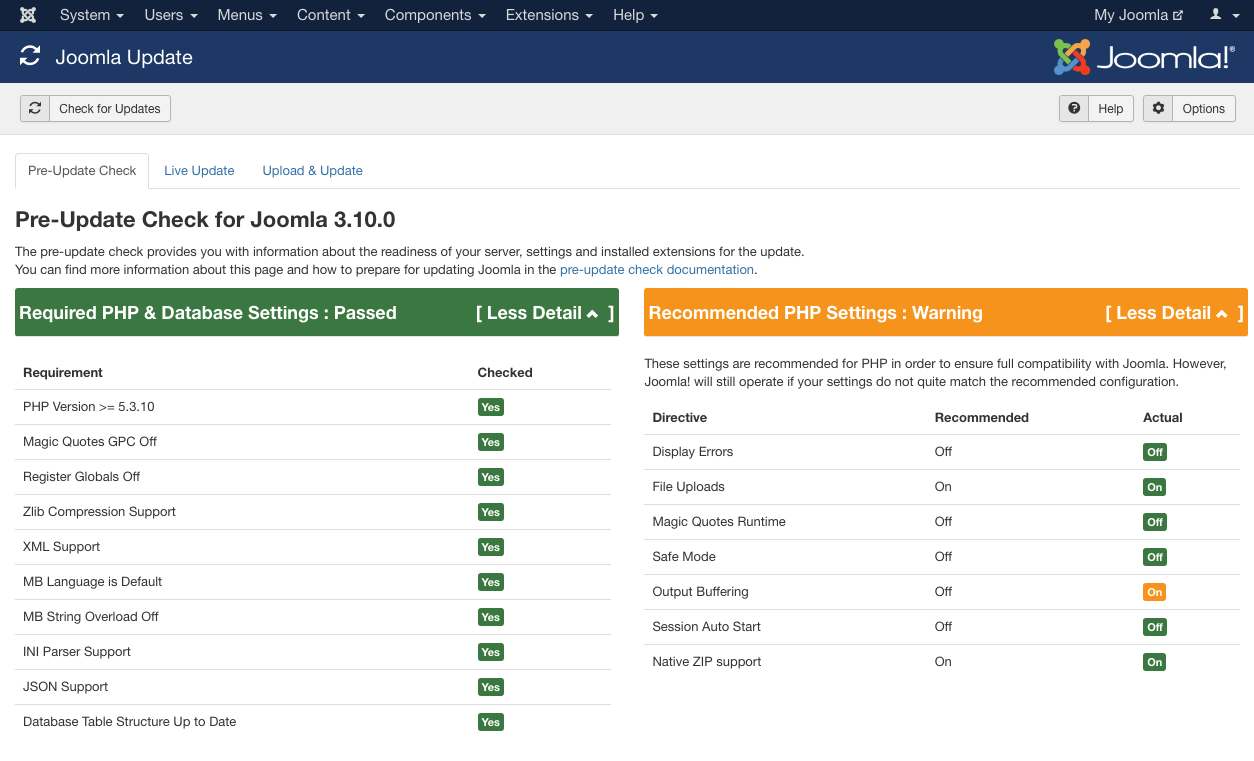 One of the latest features Joomla 3.10.X added is an enhancement to Joomla! Update Component. The Pre-Update Check allows an analysis of Required PHP and Database settings, PHP Settings, and Extensions Check so you can make sure your update is seamless.