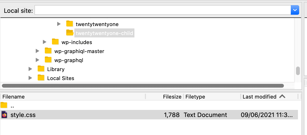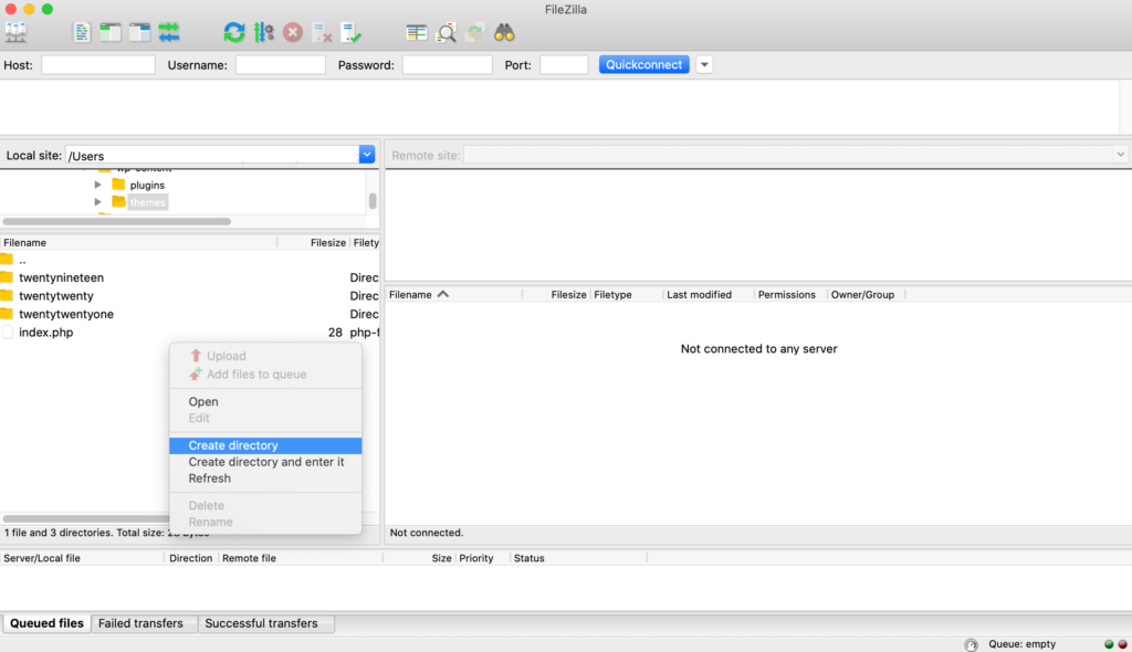 In FileZilla, navigate to wp-content/themes and create a new folder. When naming your directory, we recommend using the parent theme’s name, appended with -child: