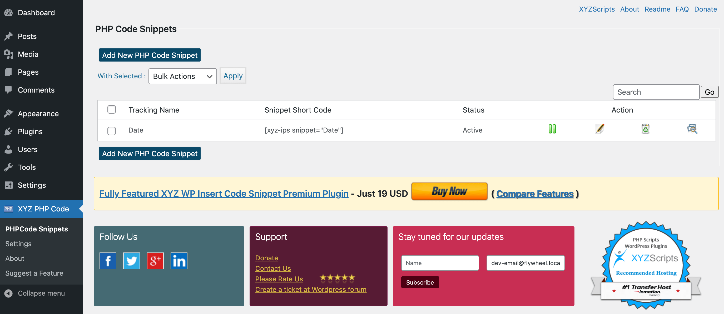 To delete a snippet, navigate to XYZ PHP Code > PHPCode Snippets. Then, locate the snippet that you want to scrub from your WordPress website and click on its accompanying Delete action.