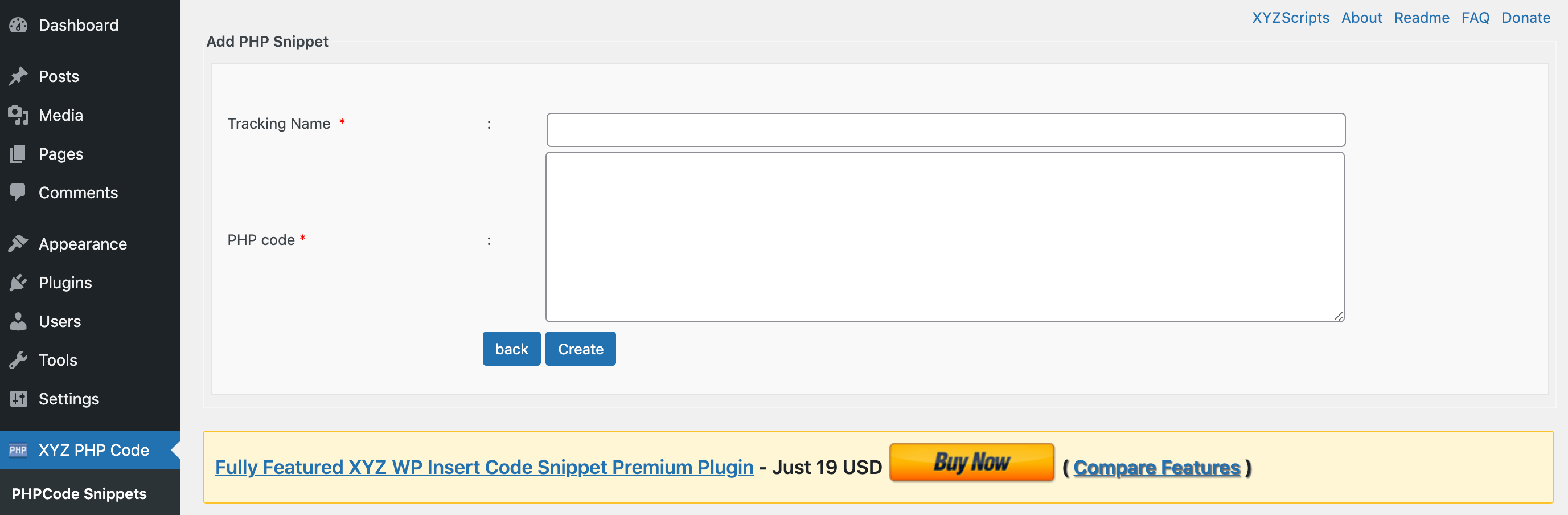 In the Tracking Name field, you'll need to give this PHP snippet a title. This will represent the PHP function throughout the WordPress dashboard, so it’s a good idea to choose something distinctive. You’ll also use the tracking name when calling this snippet manually. When you’re happy with the information you’ve entered, click on Create.