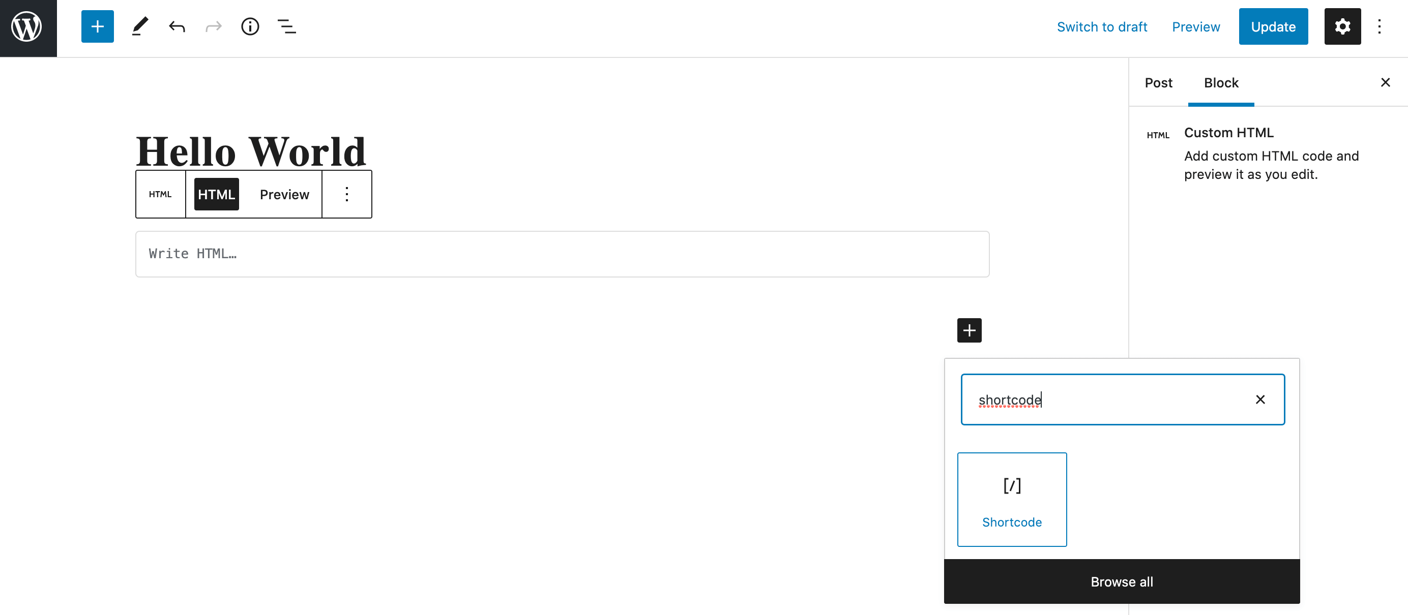 Next, open the page or post where you want to insert the associated PHP. You can then create a new shortcode block: