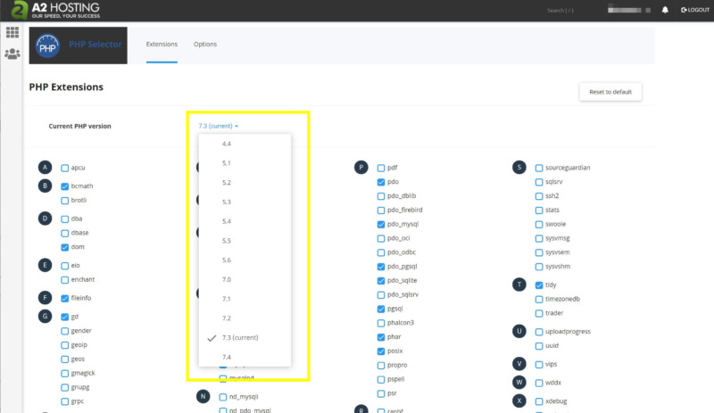 This tool enable you to easily edit your PHP version, extensions, and settings from one place. To change the version, just click the drop-down menu at the top of the page and choose the one you want to update to: