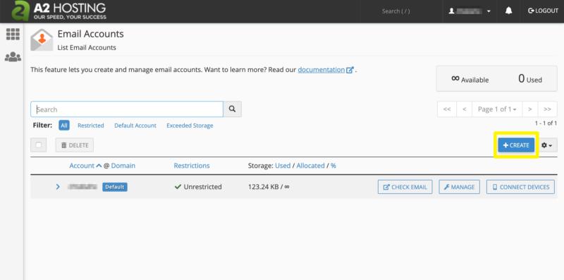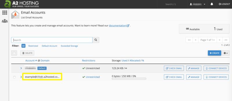 Finally, click on the Create button at the bottom to complete the process. This will take you back to your list of email accounts in cPanel: