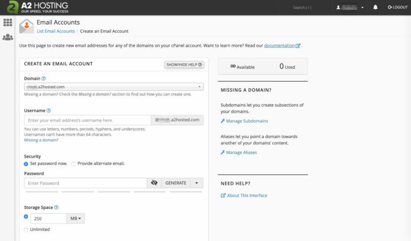 Then, select your domain from the Domain menu, enter a new email address in the Username field, a create a password for your new inbox: