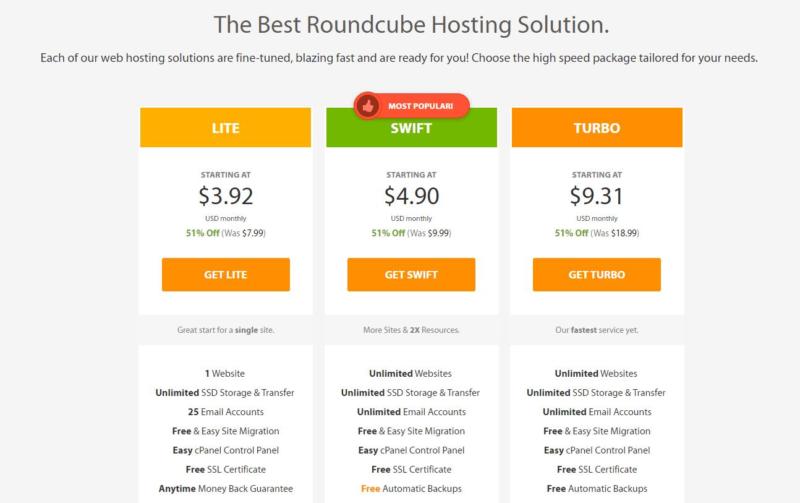 Plans start at just under $4 per month, and cap out at under $10 per month. That way, you're covered for whatever you need. Whether that's a single or unlimited account, or even regular or turbo speed, you can get it. RoundCube comes pre-installed, so you’ll be ready to email to your heart’s content.