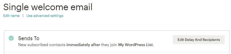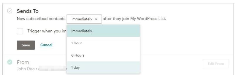 From this screen, you can set a delay for your welcome email. By default, it will send automatically when someone joins your list: