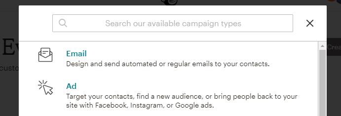 On the next screen, you can choose what type of campaign to set up. Let's go with Email: