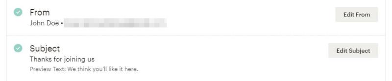 At this point, you're ready to start working on your welcome email. To get the ball rolling, you can configure from which account the email will be sent, and give it a subject: