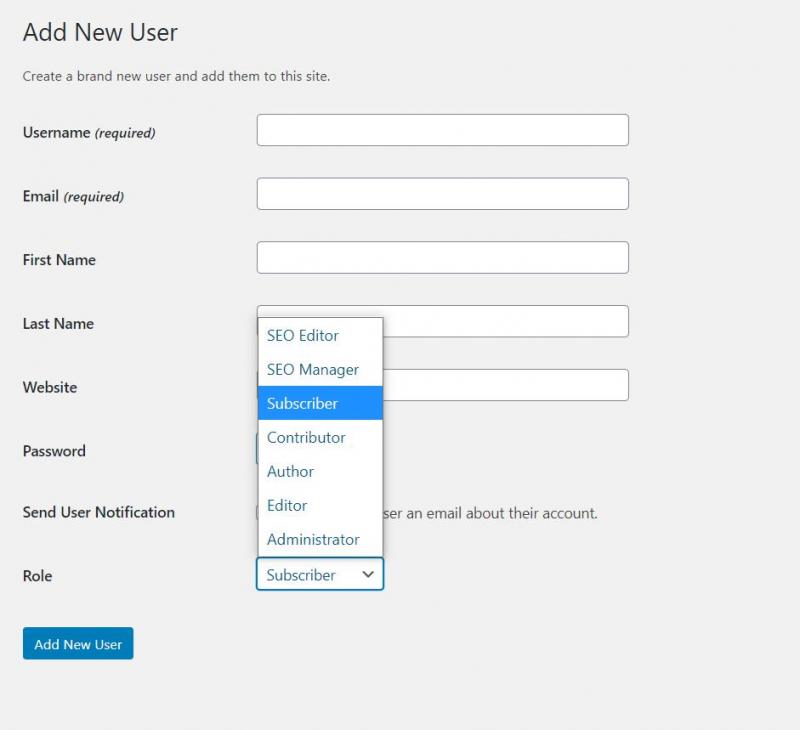 You can now add the new user’s information. This is where you get to assign a role to the user. By default, WordPress notifies the new user by email once you’ve created their new profile.