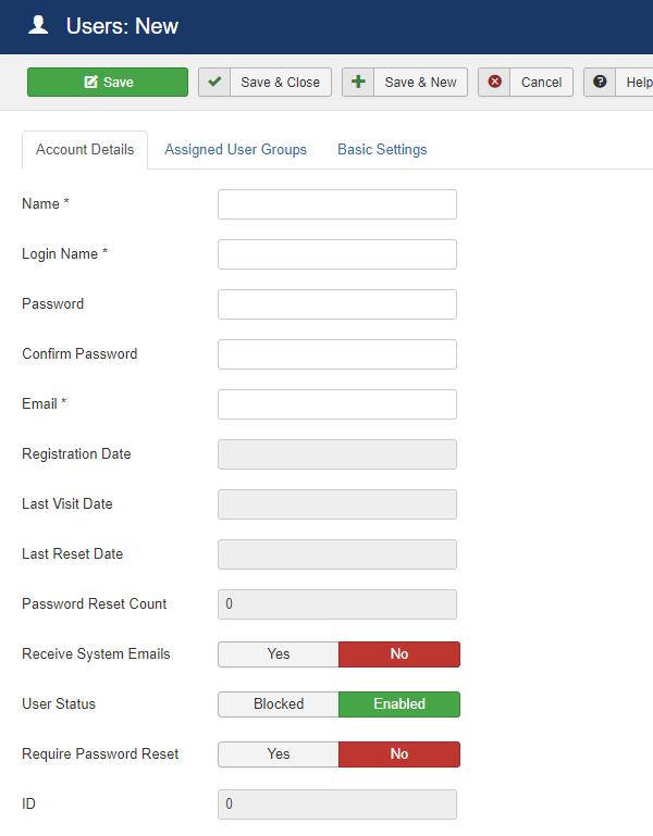 The next screen displays three tabs where you can tweak the new user’s information and privileges as you wish – Account Details, Assigned User Groups, and Basic Settings: