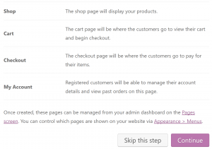 To start things off, WooCommerce will automatically create the four pages that make up the backbone of your store. These are the shop itself, a cart, the checkout process, and a personalized account page for users. The WooCommerce wizard includes information for each page – be sure to check it out before clicking on Continue: