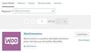 On the next screen, type “WooCommerce” in the search bar and wait for the results to come up. It should appear as the first pick unless we bungled up the spelling. Click on Install Now and then on Activate: