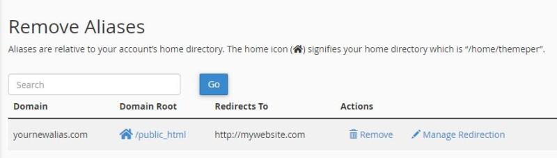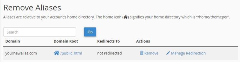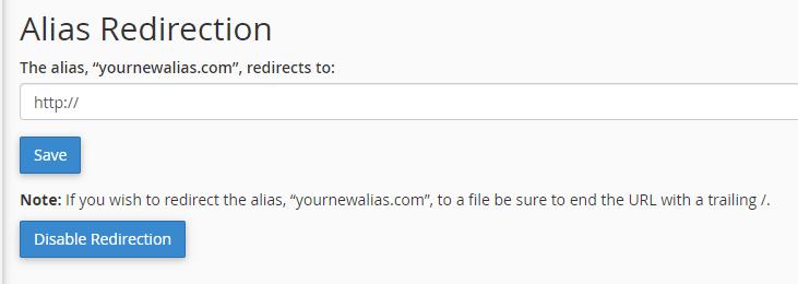 To add a redirect, return to the Aliases tab and select the Manage Redirection option. On the next page, you can enter the URL you want that alias to redirect users towards: