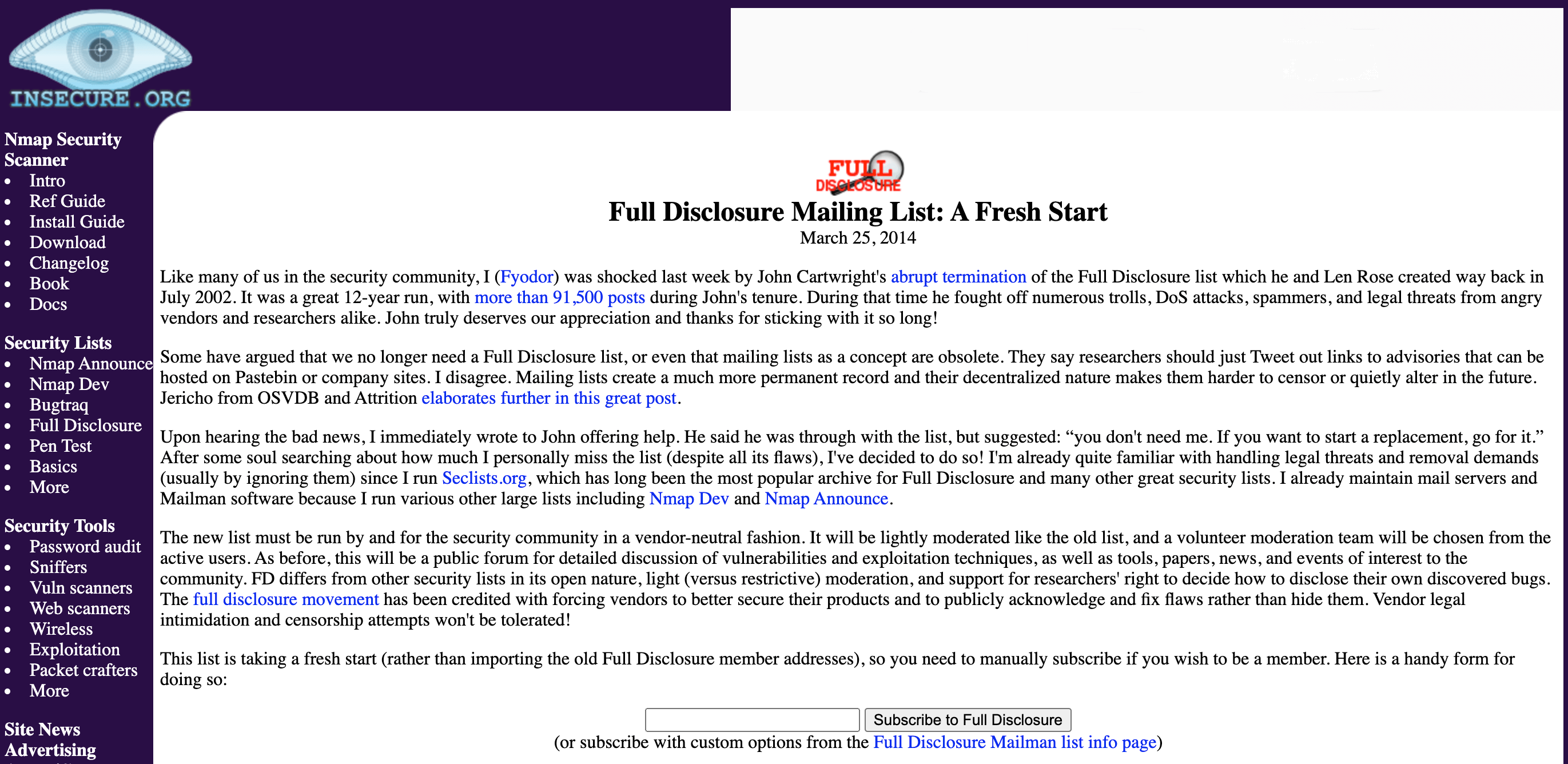 There are many different mailing lists that are dedicated to sharing vulnerability disclosures, but one of the most widely-known is Full Disclosure. By joining this mailing list, you’ll receive email notifications about the latest security threats: