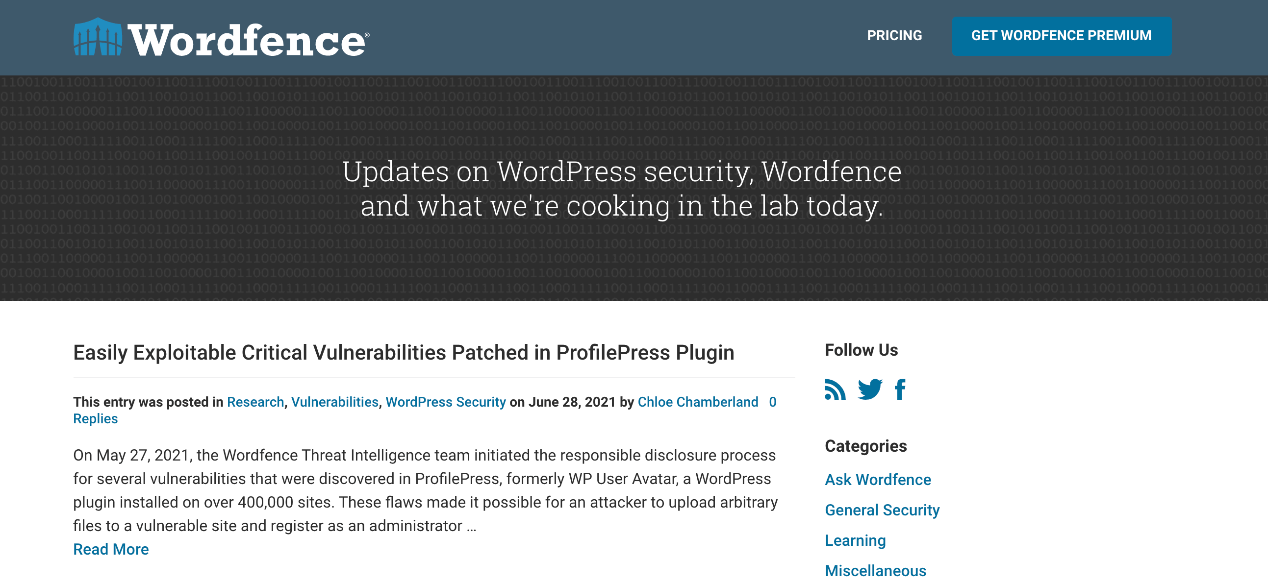 Regardless of your stance on the subject, if a vulnerability does become common knowledge then you’ll want to know about it. To keep you finger on the pulse of WordPress security, it helps to follow popular blogs such as Sucuri WordPress Security, the official WordPress blog, and the Wordfence blog:
