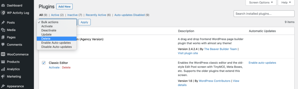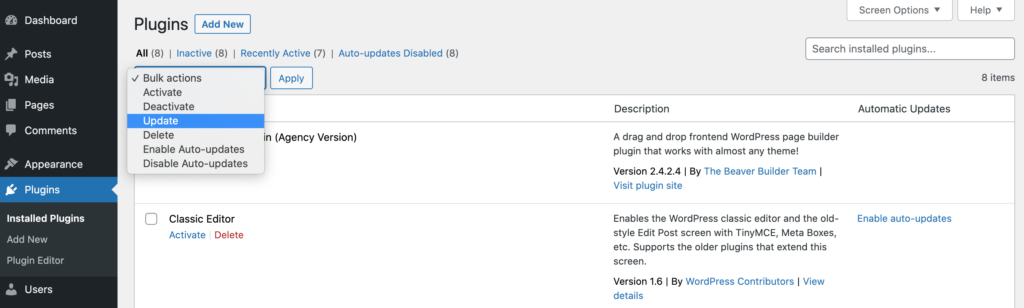 To check your plugins, select Plugins from the WordPress dashboard and then install any available updates. You can also update your plugins en masse using the Bulk Actions dropdown: