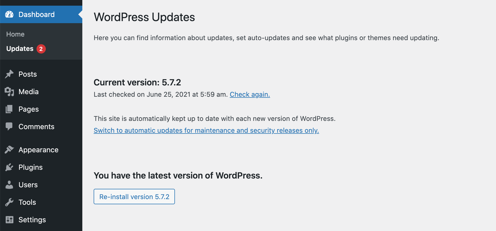 Even if the dashboard confirms that you’re fully up-to-date, it’s still worth clicking on Check again, just to verify that you are running the latest release:
