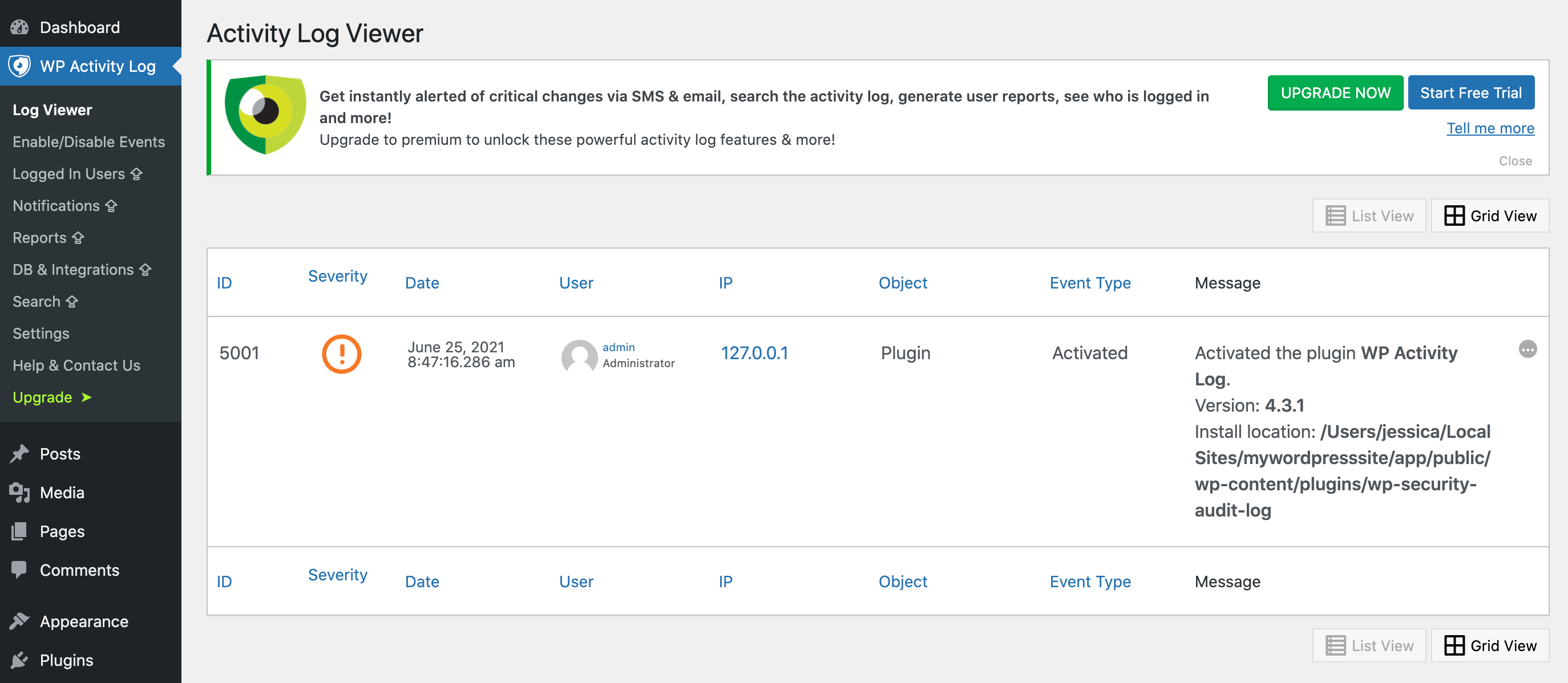 If anyone creates, modifies, or deletes any of your WordPress files, this will also appear in your activity log. If you’re using the free version, you can view the activity log at any point by navigating to WP Activity Log > Log View: