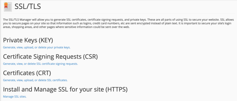 After that, look for Certificates (CRT). Underneath, the option you want will be labeled Generate, view, upload, or delete SSL certificates.