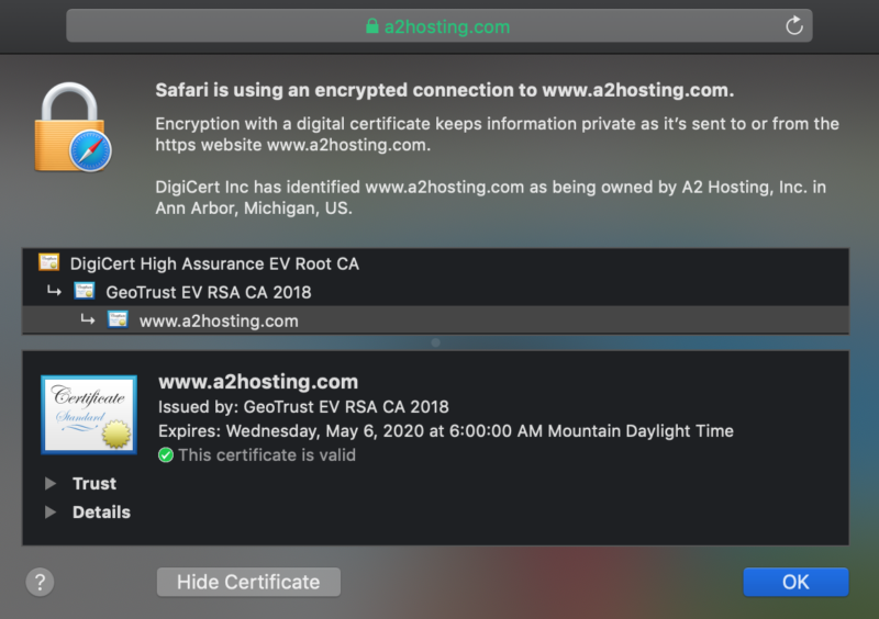 In addition, you can see more details about a website's certificate by clicking on the padlock symbol next to the site's domain name: