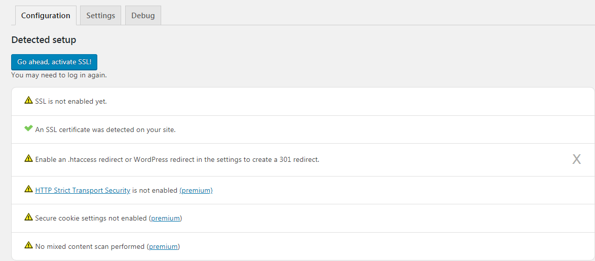 The plugin automatically detects your certificate, so all you have to do is hit the Go ahead, activate SSL! button. This will enable SSL and HTTPS for your entire site. However, you'll also find some additional configuration options under Settings if you want to tweak the way the plugin works.