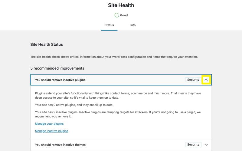For now, you’ll want to focus on any tests listed in the top half of the page. Click on the arrow to the right to expand the section for that test and view WordPress’ recommended course of action:
