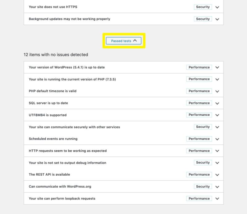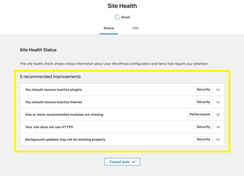 Most of the Site Health tool’s most helpful features for performance and security optimization are in the Status tab. At the top of this page, you’ll see a list of all the tests your site does not currently pass: