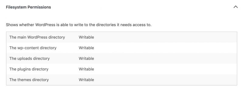 Expand this section and check to make sure each line says Writable. This is important for enabling WordPress to run updates, which is a key security best practice.