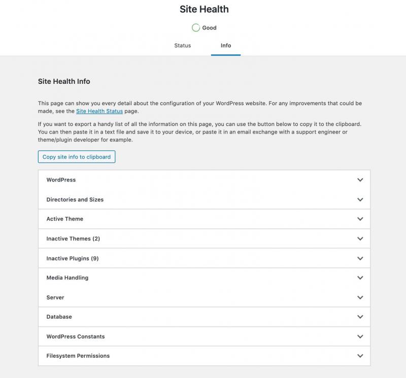In the Info tab, the Site Health tool lists some key details about your site’s configuration. This page is mostly for developers who are debugging sites: