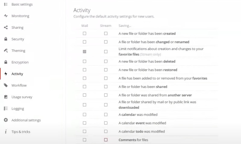 Finally, if you move on to the Activity tab you can choose what events NextCloud will log for you: