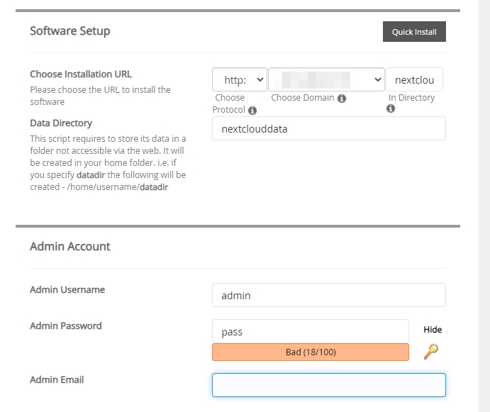 Click on the Install Now button and Webuzo will ask you to enter an installation URL for NextCloud. You'll also need to set up an admin username and password: