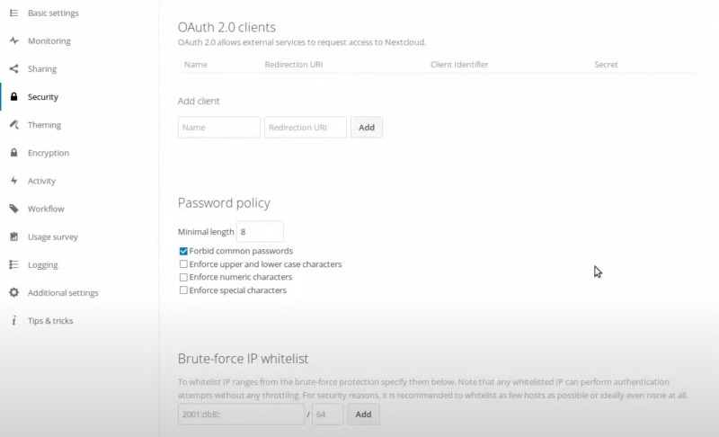Moving on to the Security settings, this section will enable you to set password policies, add clients that can get access to your cloud, and whitelist the IP addresses that can connect to it: