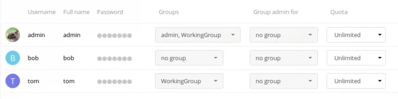 NextCloud enables you to assign users to groups, give them admin privileges for specific groups, and even set individual file storage quotas.