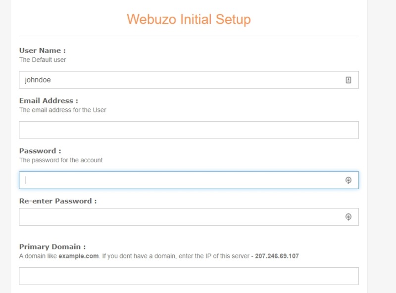 Go ahead and access the URL Webuzo indicates to start installing apps. In the next section, we'll setup the private cloud storage solution you'll be using.