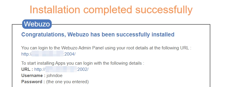 Now you'll need to wait while Webuzo finishes installing. Once it's ready, Webuzo will share instructions on how to login to its admin panel and the Softaculous dashboard: