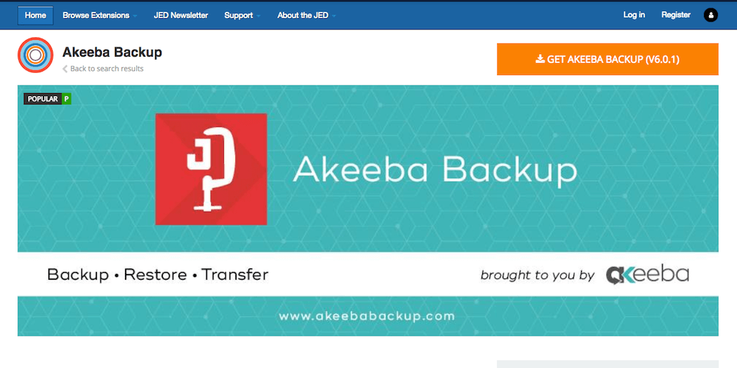 There’s no way to perform automatic backups in Joomla by default, but you can do so using the Akeeba Backup extension. With it, you can create one-click backups and download them to your own hard drive or a cloud service. These backups can be used to restore your site, and also to transfer or copy it if needed.