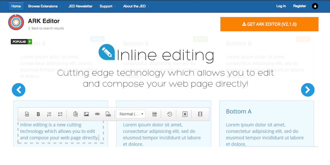 ARK Editor: A ‘What You See Is What You Get’ (WYSIWYG) editor, which enables anyone to edit content in Joomla without needing to know code.